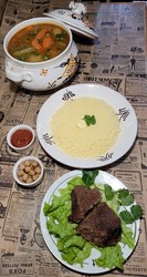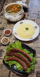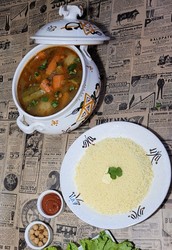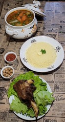 Composition du Poulet : blé cuit à la vapeur et roulé à la main, sauce et ses légumes (carottes, courgettes, navets, potiron, oignons, céleris, pois chiches), Cuisse de poulet rôti marinée.